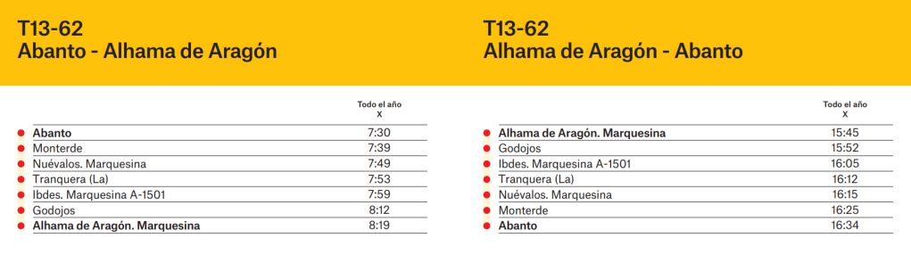 Y una nueva línea, Abanto-Alhama de Aragón (T13-62), que operará los miércoles, saliendo a las 7:30 h, y llegando de vuelta a las 16:34 h.