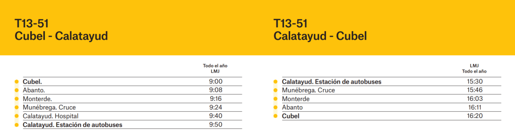 La tradicional, de Cubel a Calatayud (T13-51), que funcionará los lunes, martes y jueves (pasando por Abanto a las 9:08 en el trayecto de ida, y a las 16:11 h en el trayecto de vuelta.